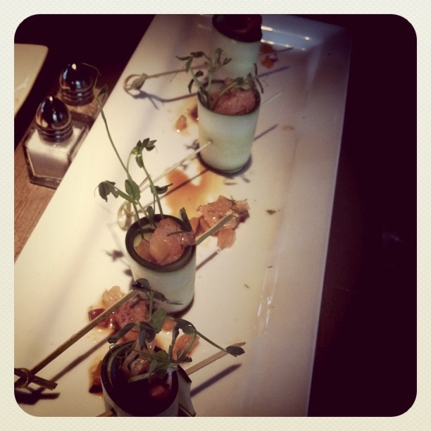 goat cheese wrapped in cucumber topped with a grapefruit red-plum ragout, pea shoots, and sherry.